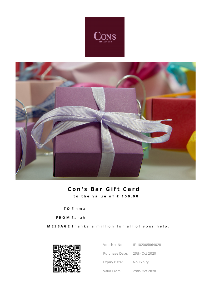 Con's Bar allows you to purchase instantly printable gift vouchers, special offers and tickets using the Voucher Connect platform.
